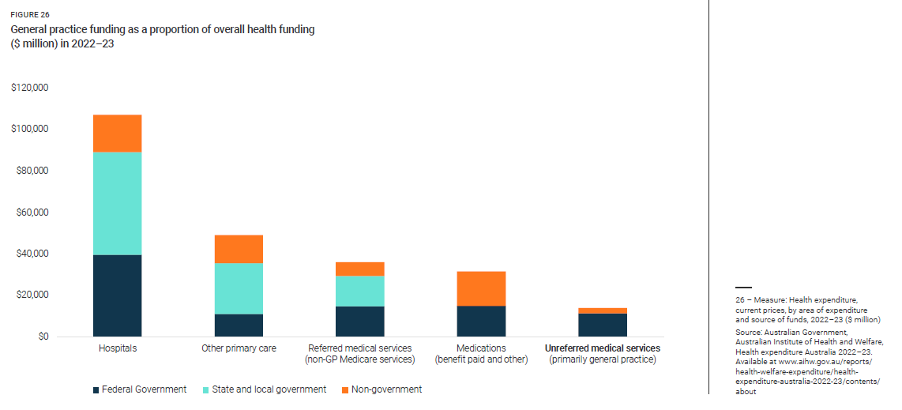 The irony? Primary care receives the lowest proportion of government funding (see image below), and to top it off, the longer the consult, the less your rebate per minute.