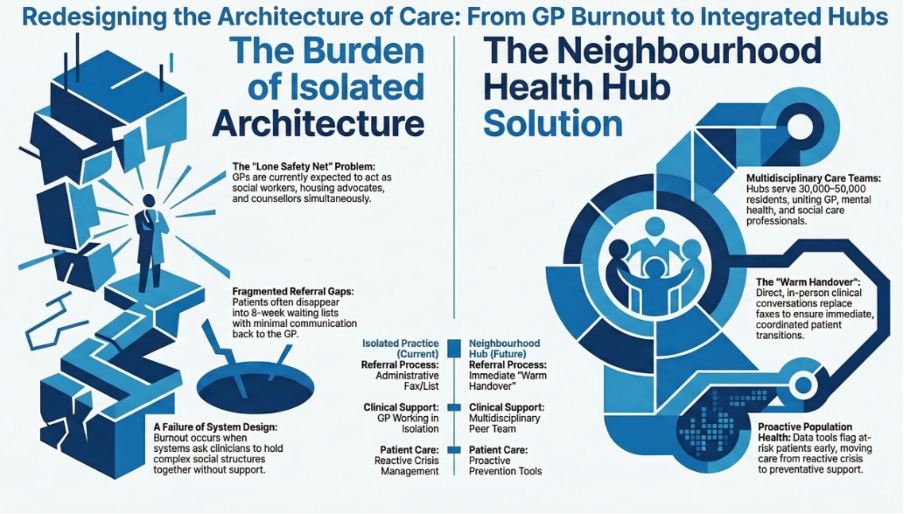Neighbourhood health hubs change that. You’re connected to a multidisciplinary team. You share complex cases. You learn from colleagues you might otherwise never work alongside – the physiotherapist who spots the mental health signal; the social worker who understands the family dynamics; the community nurse who has seen the home environment.