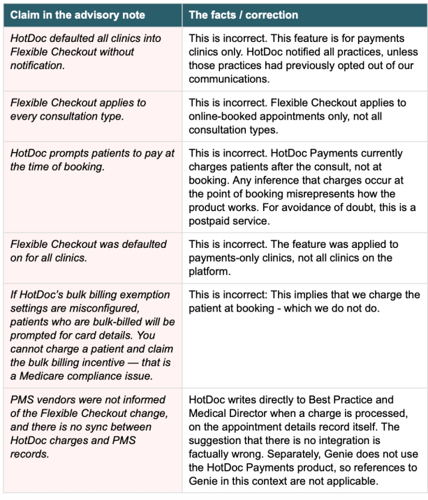 Article Update: HotDoc have responded to the HealthAndLife Advisory note with the following table pointing out that in their view some of the points in the note are incorrect. The table of their response is below. We asked HealthAndLife to respond to the HotDoc response and they noted that their advisory note was in response to what they been told directly by their clients and had themselves been reading on social media posts, that the note was put together based on this input not on discussions with HotDoc, in order to address the issues raised by their clients and on social media. HealthAndLife had supplied TMR with the advisory note on background and they did not intend it to be published to anyone else other than their own clients.