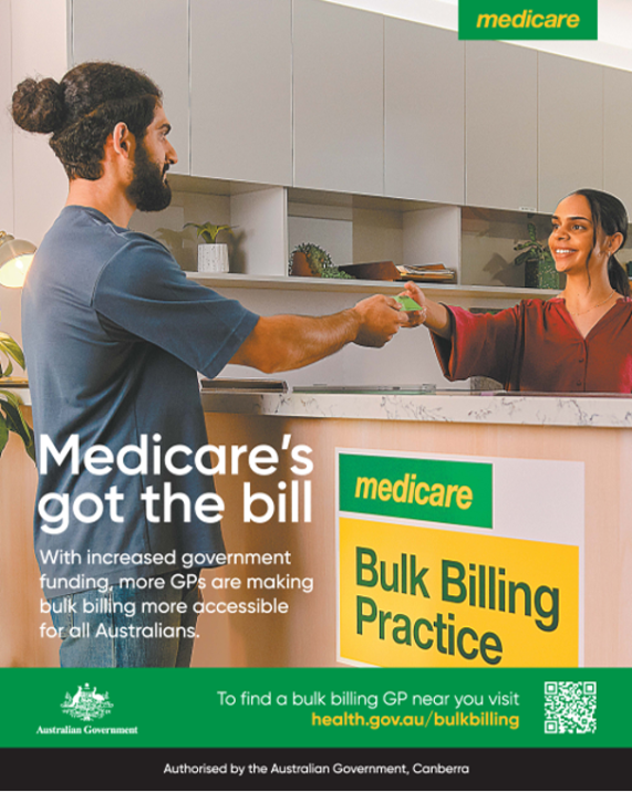 Specific assets provided by DoHDA include a poster featuring a patient at the reception desk of a GP clinic sporting the mandatory ‘bulk billing practice’ signage alongside the “Medicare’s got the bill” tagline.
