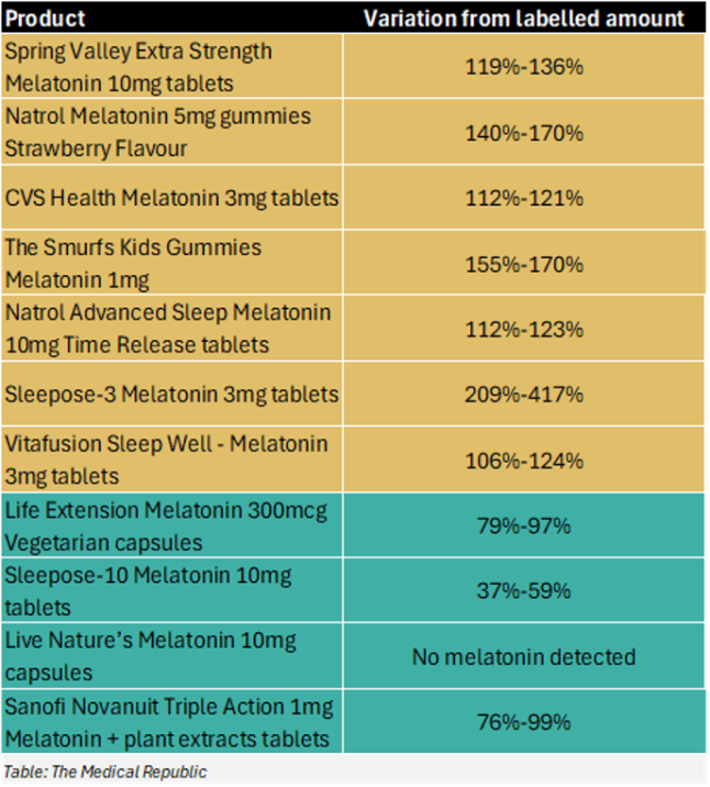 “The results indicate significant discrepancies in the actual melatonin content compared to the labelled amounts. One product contained more than 400% of the labelled content and another containing no melatonin at all.”